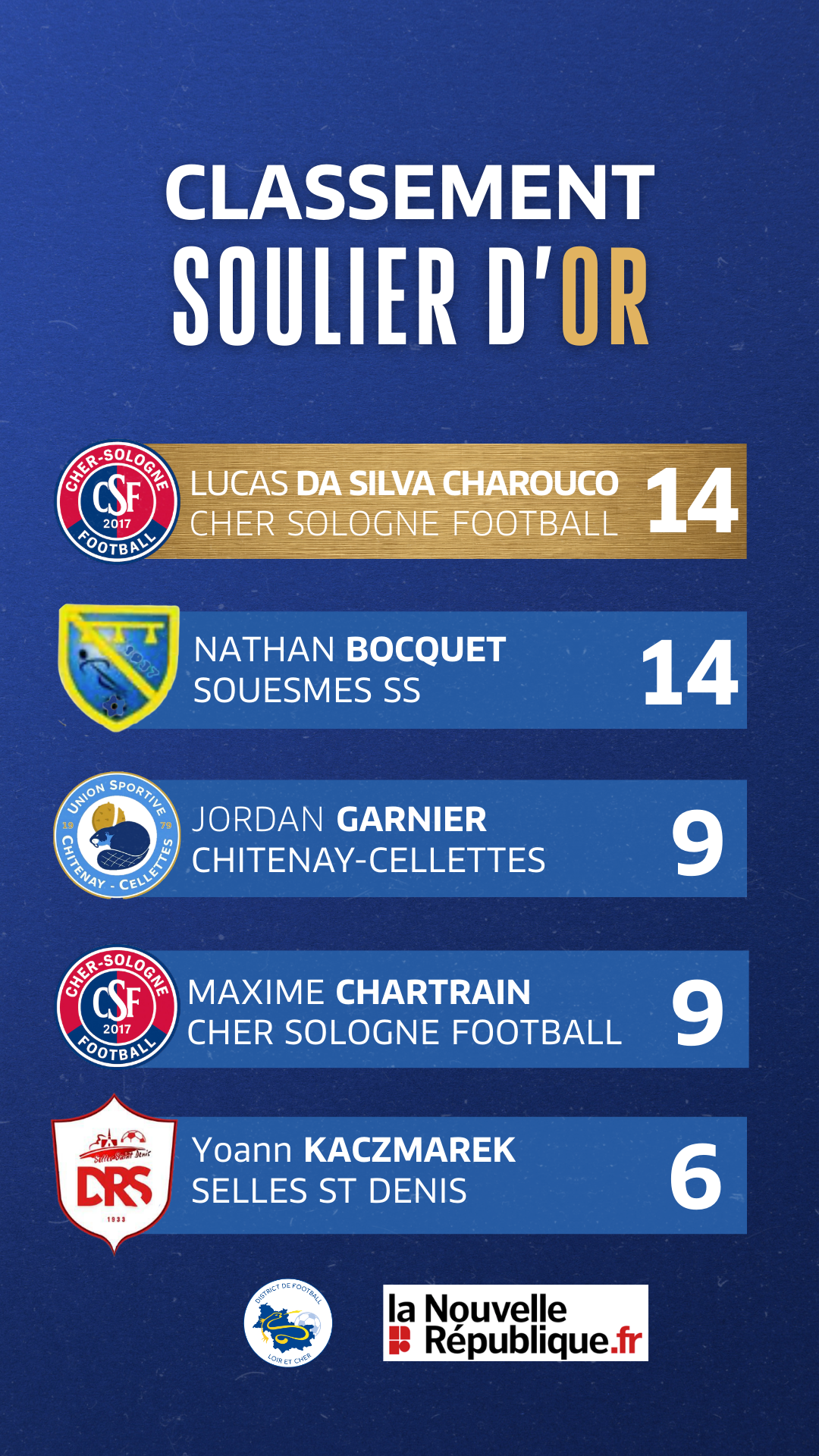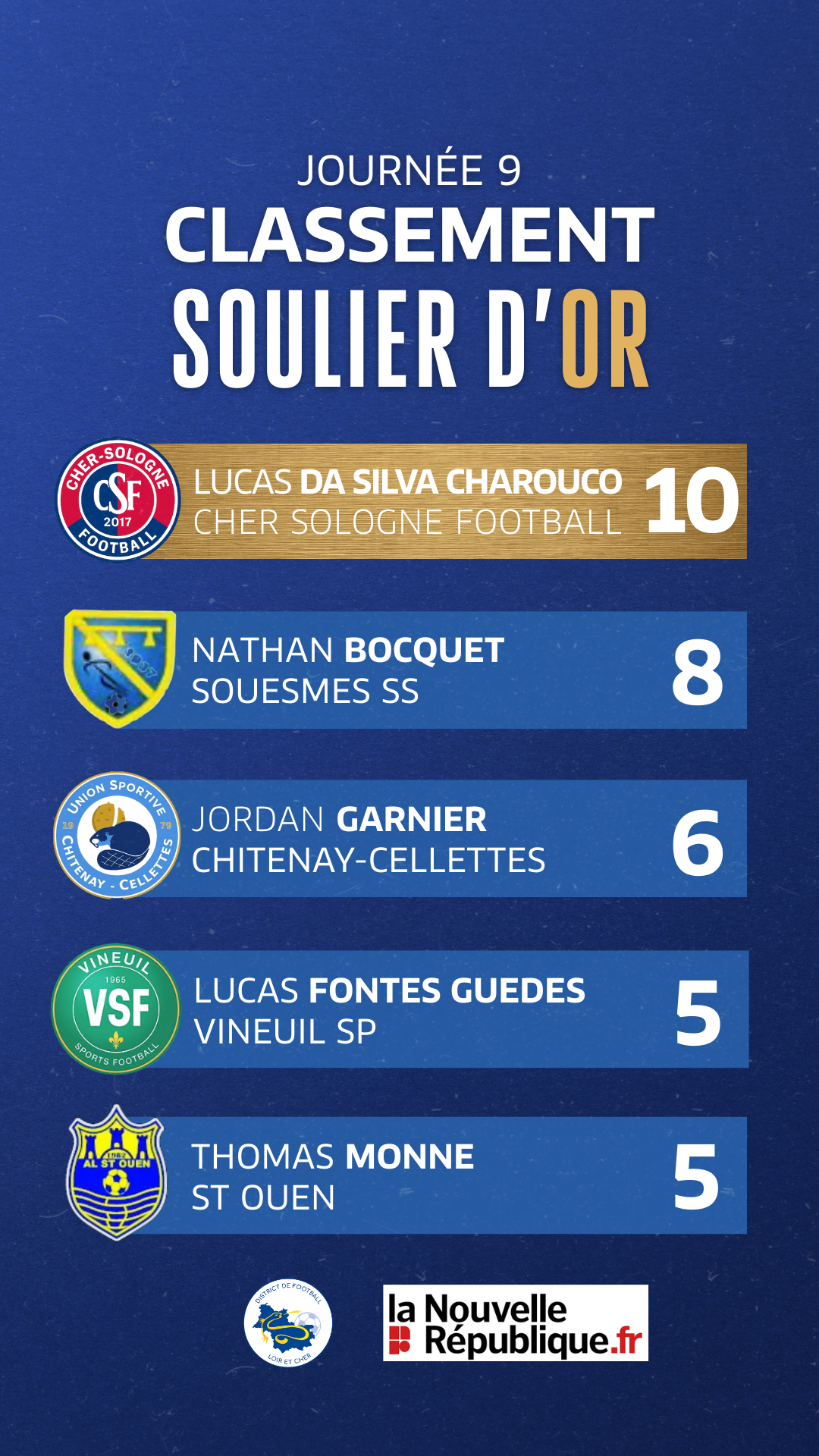 Le District de Loir-et-Cher de Football, en partenariat avec La Nouvelle République, est ravi de vous présenter le Top 5 à l’issue de cette 9ème journée de Départemental 1 !